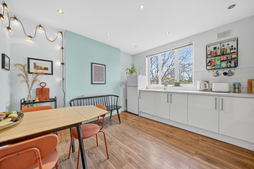 This bright and welcoming home offers a spacious reception room and a dine-in kitchen, ideal for both relaxing and entertaining. The kitchen and bedroom enjoy leafy outlooks, creating a calm and pleasant atmosphere, while the generous double bedroom overlooks the attractive communal gardens. Residents also benefit from access to these well-kept gardens, perfect for enjoying summer barbecues with friends and family, as well as external storage and cleverly designed hidden kitchen storage.